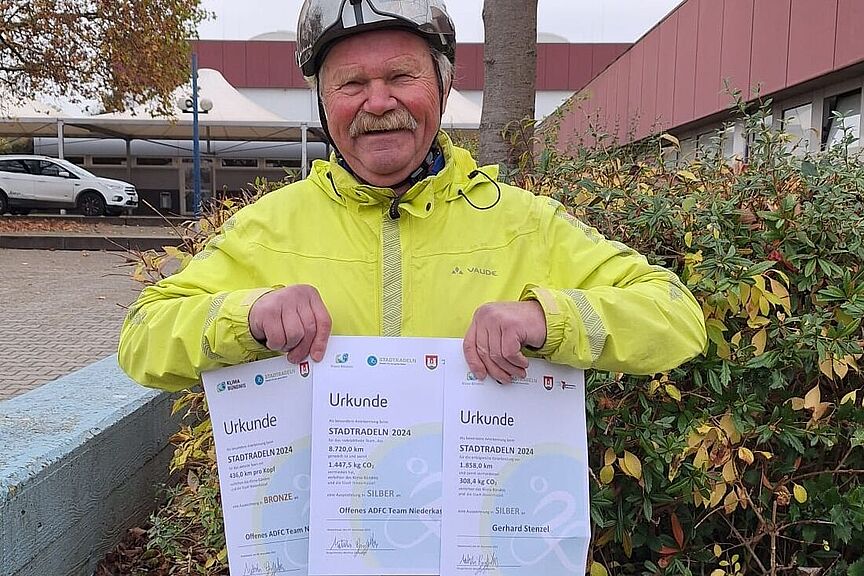 Sehr erfolgreich hat das Offene Team des ADFC Niederkassel auch beim Stadtradeln Niederkassel abgeschnitten. Bei der Preisverleihung im Rahmen des 1. Niederkasseler Klimatages am 9.11.2024 wurde das Team mit gleich drei Urkunden ausgezeichnet: Gerhard Stenzel landete mit 1.858 geradelten Kilometern stadtweit auf Platz 2 und erhielt dafür eine silberne Urkunde. Ebenfalls den zweiten Platz und damit Silber erreichte das Offene ADFC-Team Niederkassel für die insgesamt geradelten Team-Kilometer. Das Team mit 20 aktiv Radelnden schaffte 8.720 km - eine Strecke, die insgesamt fast 1,5 Tonnen CO2 entspricht. Pro Kopf waren das immerhin 436 km, wofür es eine bronzene Urkunde (Platz 3) gab.