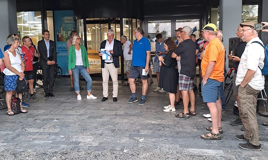 Mit guten Wünschen des Bürgermeisters im Gepäck machte sich die Gruppe dann auf den Weg über Troisdorf nach Siegburg, wo im Rahmen der vom ADFC organisierten Sternfahrt zahlreiche Radfahrerinnen und Radfahrer aus dem rechtsrheinischen Kreisgebiet eintrafen. Auch ein aufziehendes Gewitter konnte die gute Stimmung nicht trüben. Landrat Schuster betonte vor dem Kreishaus die Bedeutung des Radfahrens für Klima, Mobilität und Gesundheit. Die Teilnahme am Stadtradeln seit 8 Jahren sei gutes „Brauchtum“, in jedem Jahr habe man die Kilometerzahl bisher steigern können, und das erhoffe er sich auch für dieses Jahr. Den Radfahrenden wünschte er eine gute und sichere Fahrt.